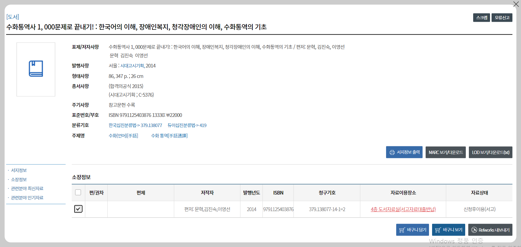 ③ 원하는 도서를 찾았다면 제목을 클릭한다. 그러면 상세한 도서정보를 볼 수 있는데 이 화면에서 하단 소장정보 체크박스에 체크를 하고 바구니에 담는다.(여기서 총 페이지수를 확인하고 넘어간다. 이유는 뒤에 나옴)
