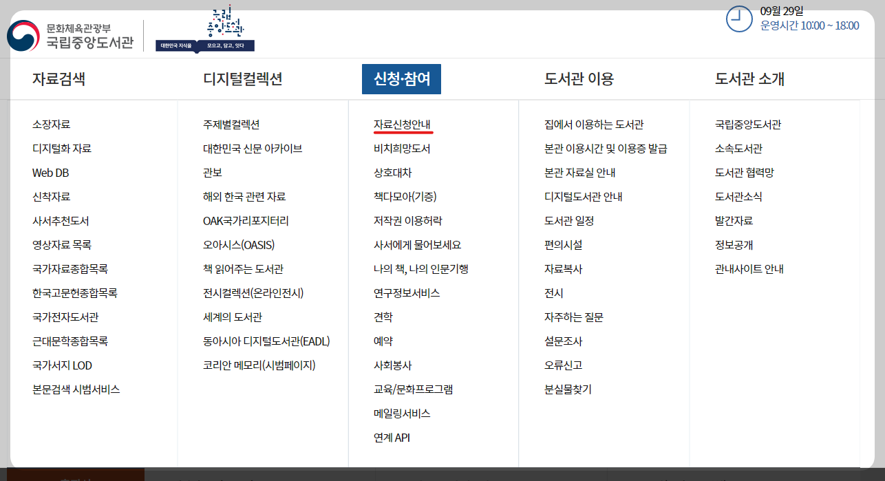 메인 페이지에서 신청●참여 카테고리에 마우스를 올리고 맨 위에 자료신청안내 항목을 클릭한다.