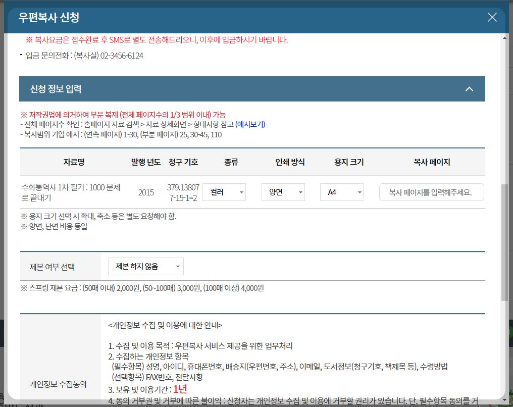 매우 만족하고 있던 순간 반전은 우편비용은 별도인데 일반 배송으로 하면 4000원, 세 번을 진행하면 총 12,000원이다. 복사비용과 우편비용을 다 합치면 책한권 구하는데 35000원의 비용이 든다. 이 정도 비용을 들일만 한가 잠시 생각했지만, 따로 알아봐서 구할 생각을하니 너무 귀찮아서 이왕 신청한거 이대로 진행해보기로 했다. 사실 1/3씩 세번을 나눠서 진행하는 것이 가능한지도 아직 잘 모르겠지만 뭐 안될 이유는 없겠지?
