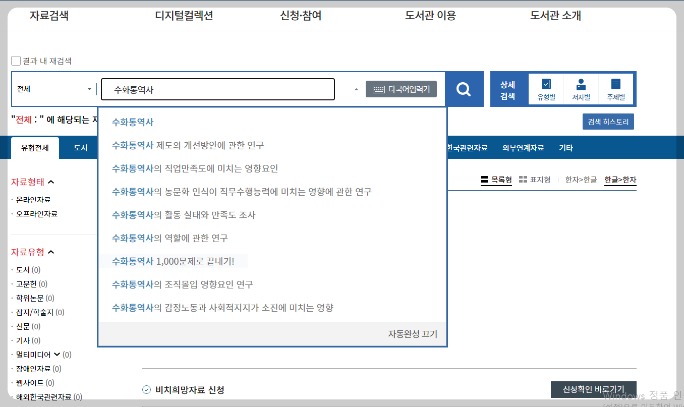 ② 자료신청안내를 클릭하면 자료 검색하기 버튼이 나온다. 클릭해서 내가 찾는 도서의 제목(완전한 제목을 모른다면 일부)을 검색한다. 아래 이미지와 같이 키워드를 입력하면 제목에 해당 키워드가 들어간 도서들을 모두 볼 수 있다.