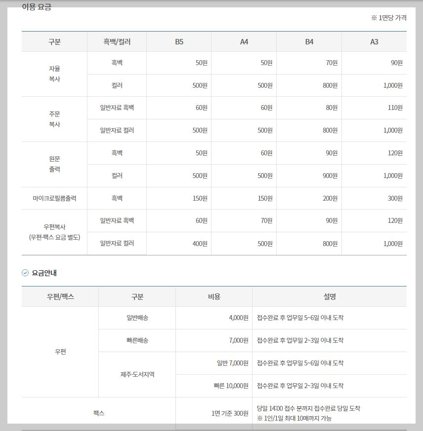 비록 1/3밖에 신청할 수 없지만 구하기 어려운 책을 나름 간단한 방법으로 구할 수 있어 좋다고 생각했다. 따로 결재요청은 없었는데 신청내역을 확인해보니 접수 중으로 보인다. 아무래도 무료는 아닐 것 같아서 자료를 찾아봤더니 역시나 친절하게 안내되어있었다. 흑백과 컬러의 가격차가 어마어마하다. 나는 총 110페이지를 별생각 없이 컬러로 신청했는데 총비용이 55000원이다. 딱히 컬러가 필요한 것도 아니니 얼른 취소하고 흑백으로 신청을 변경해야겠다. ㅎㅎ 얼른얼른.