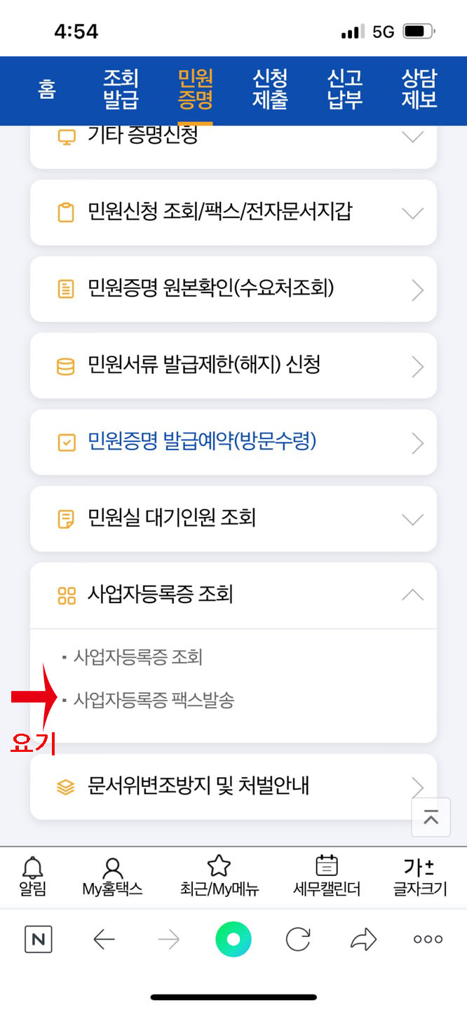 두번째에 사업자 등록증 팩스발송이라는 항목이 보이고, 그 항목을 다시 클릭한다.
