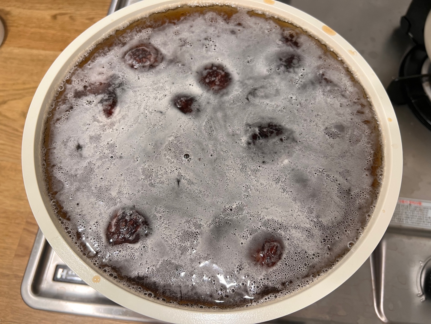 율피까지 깨끗하게 제거되면, 이제 설탕을 넣고 졸이는 과정이 남았다. 밤이 모두 잠길만큼의 물을 붓고 밤무게의 50% 분량의 설탕과 함께 밤을 졸여준다. 아래 사진처럼 밤을 졸일 때 생기는 흰 거품을 제거해주면 더 깨끗하고 매끈하고 예쁜 색감의 보늬밤을 만날 수 있다. 번거롭더라도 꼭 제거를 해주는 것이 좋다.