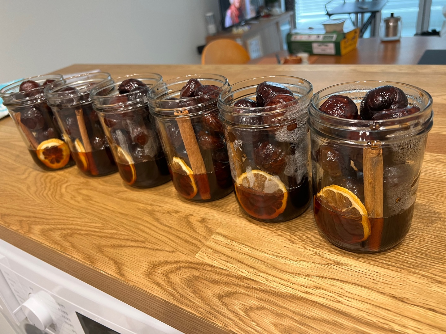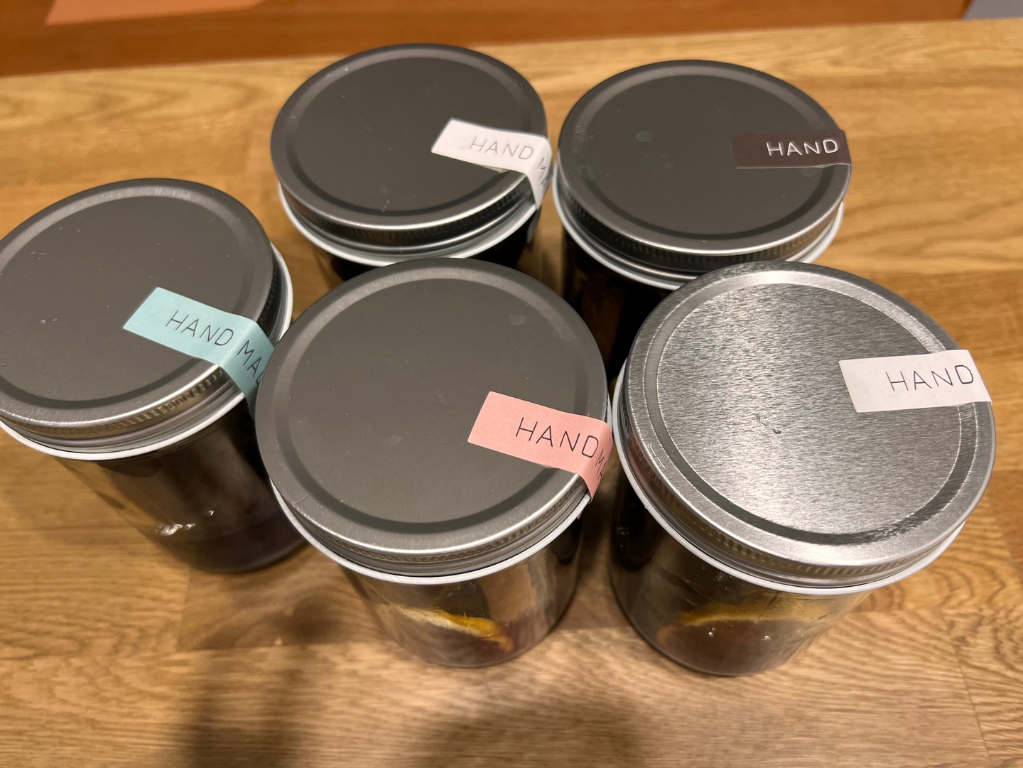 드디어 보늬밤이 완성되었다. 완전히 식힌 다음 열탕소독해 준비한 병에 옮겨 담아준다. 할머니와 엄마아빠 간식으로 보내드릴 거라서 예쁘게 담아 라벨도 붙여 완성했다. 이틀에 걸친 너무 힘든 과정이었지만, 완성된 모습을 보니 뿌듯하다.