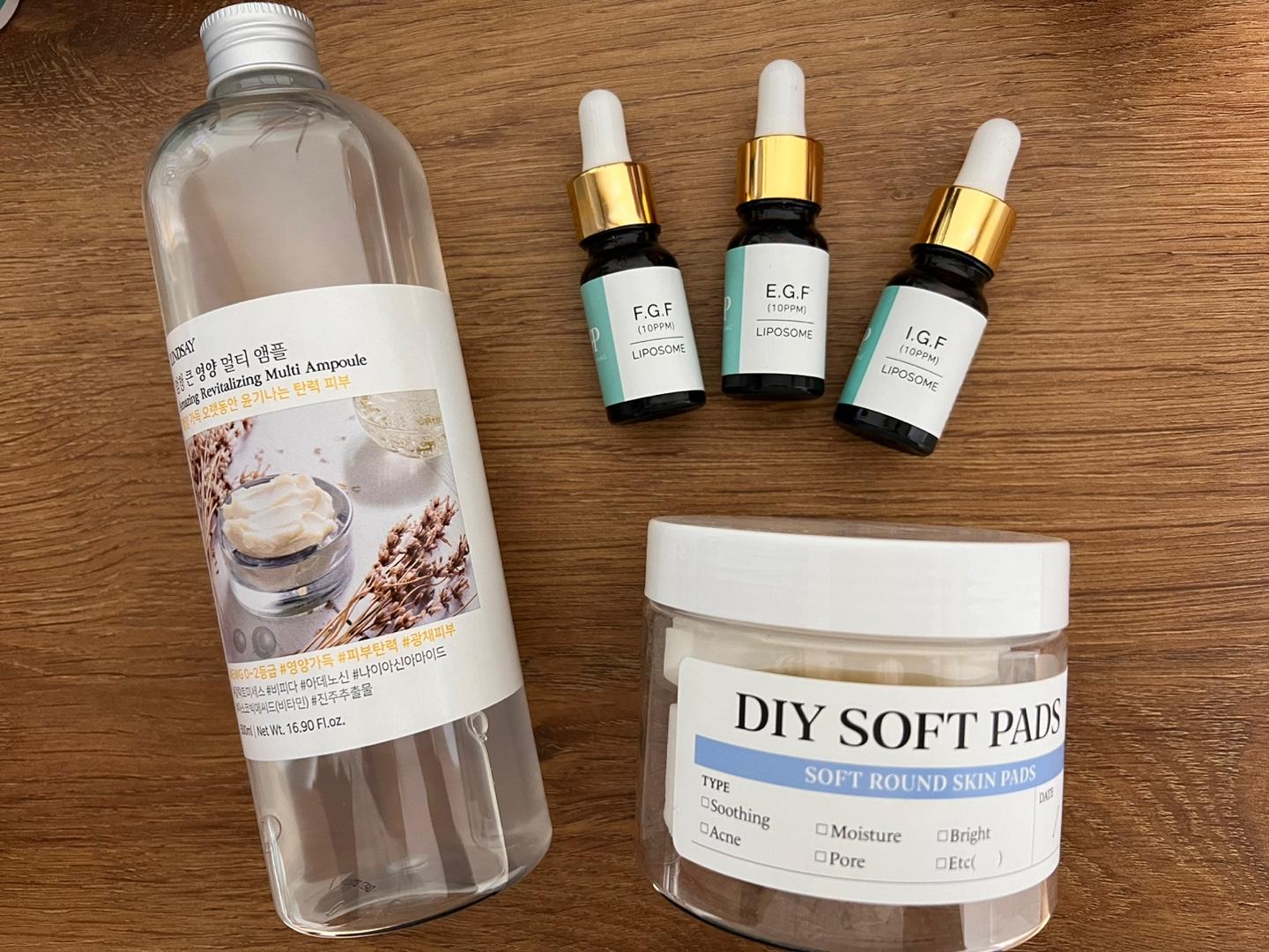 EGF FGF IGF 원액을 적당량 섞어 패드를 충분히 적셔 욕실에 두고 저녁 세안이 끝난 뒤 얼굴에 10분정도 붙여두었다가 떼어내고 기초를 바른다.